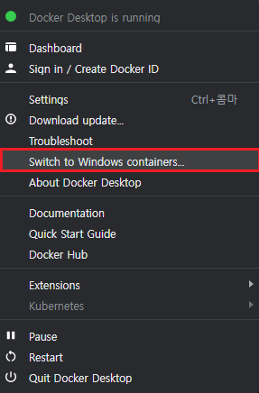Windows Docker Desktop에서 오른쪽 마우스 클릭 > window 컨테이너로 전환하면 사용할 수 있다.